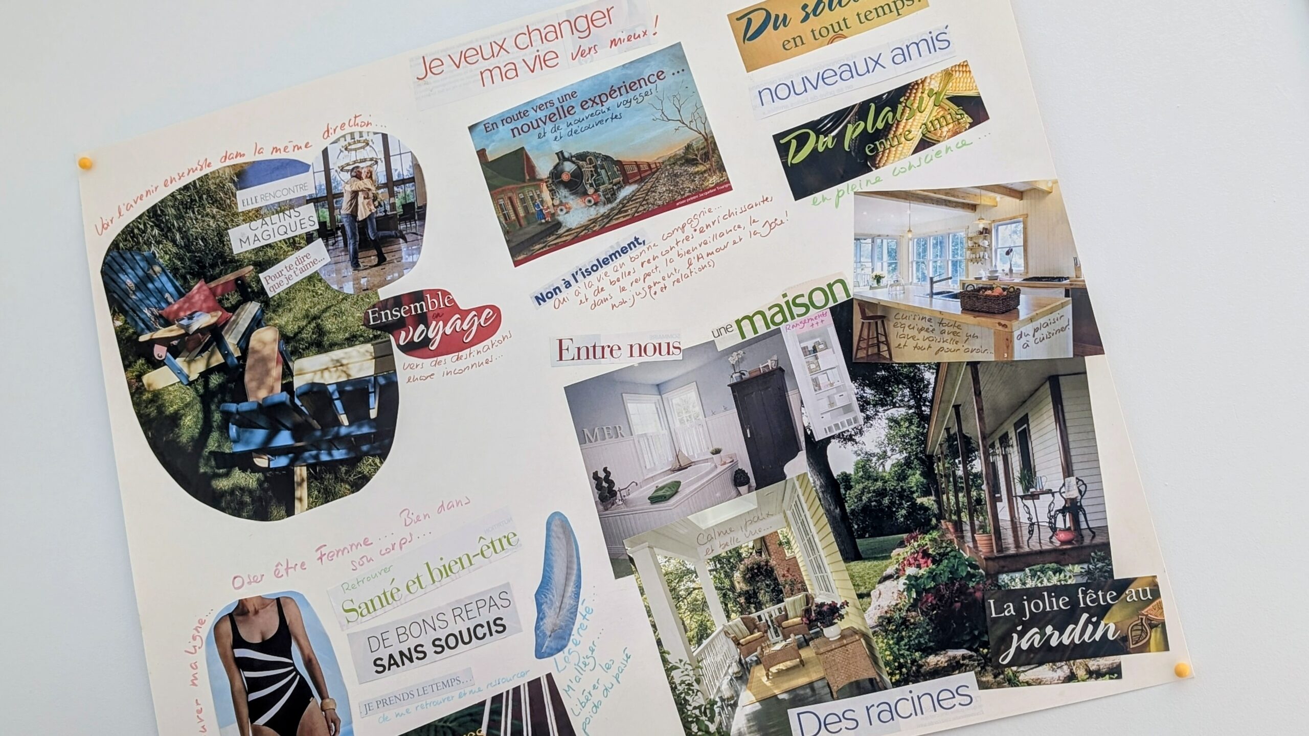 Je le fais de façon intuitive, juste à tourner les pages des magazines et découper images et textes qui me parlent avant de tout coller sur un grand carton. On voit ensuite ce que notre âme a prévu pour l’an prochain.