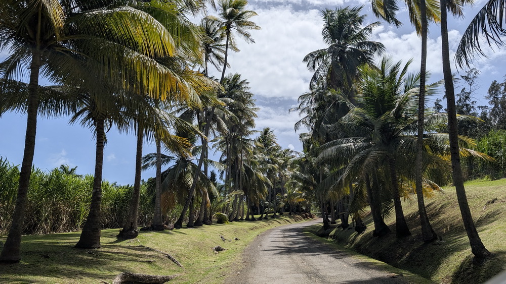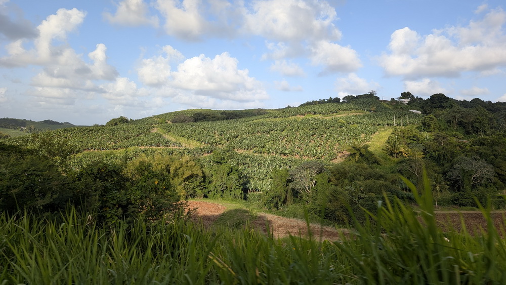 Champs de cannes à sucre et champs de bananiers à perte de vue, arbres immenses et verdure parasitant d’autres arbres amicalement forment un paysage dense et verdoyant.