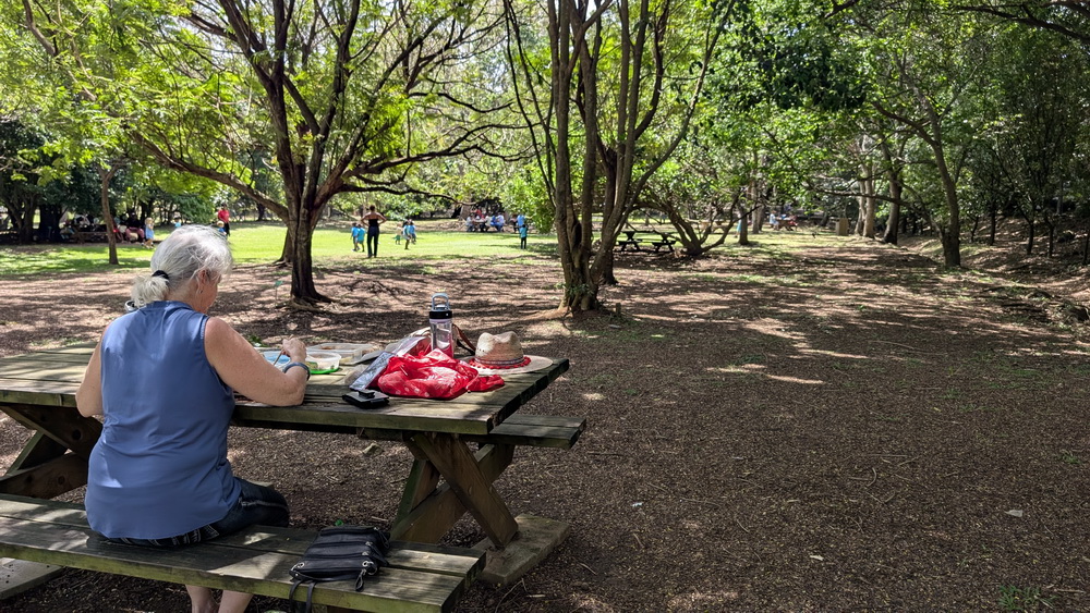 Après avoir mis notre voiture au parking, on s’arrête sous les arbres, en face d’un grand champ de bananiers, pour manger notre lunch avant d’aller visiter les deux salles de musée.
